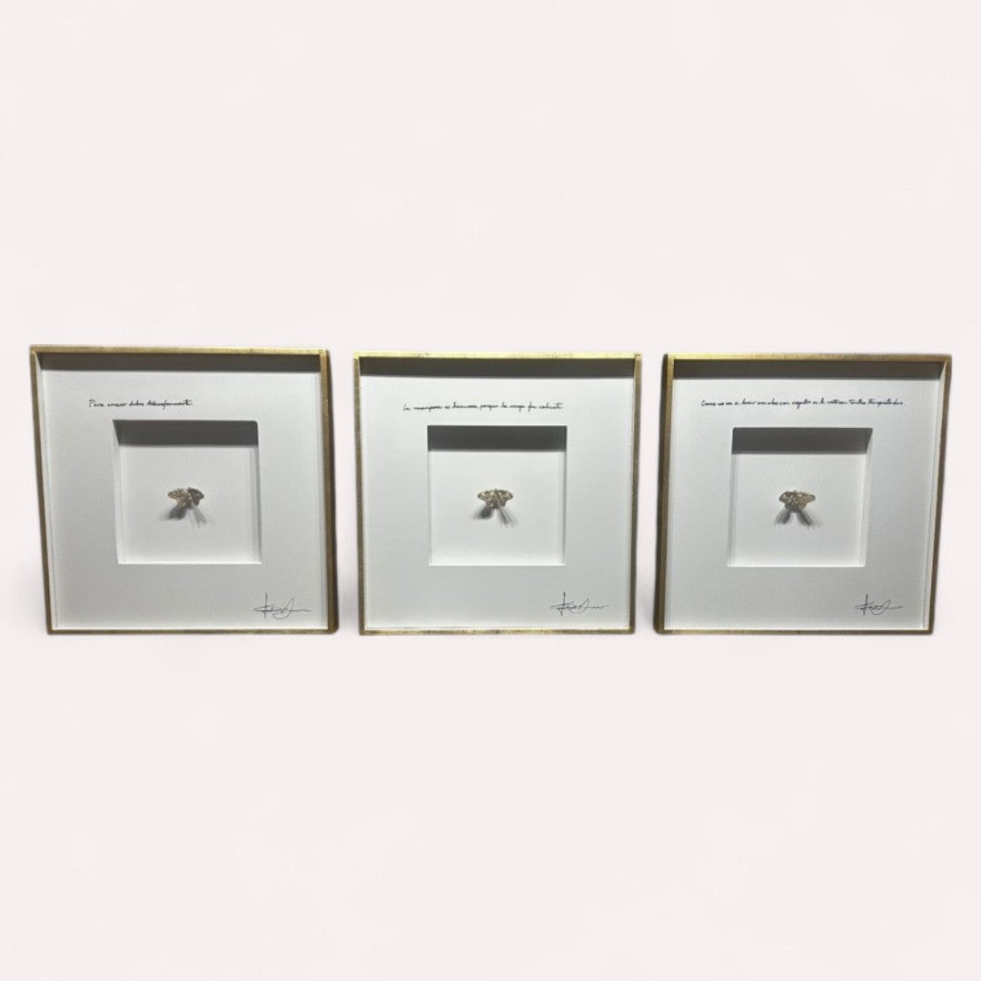CUADRO POESÍA DE MARIPOSAS SET DE 3 BLANCO IDILIO MARCO ORO MEDIDAS: .60 X .60 C/U