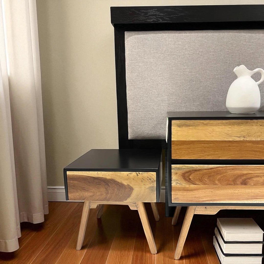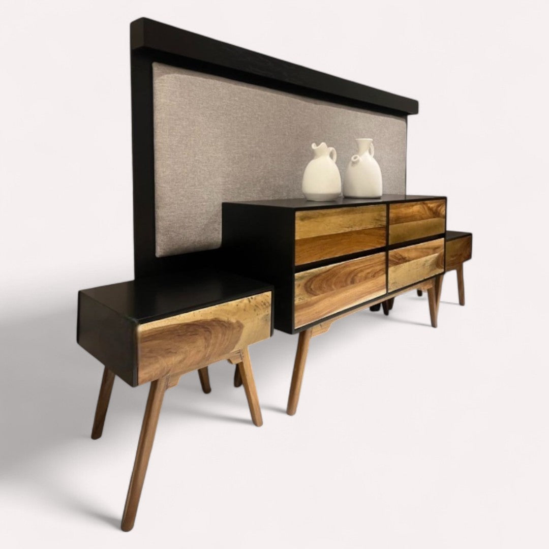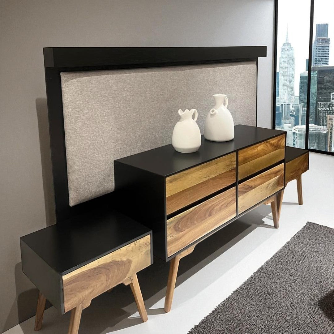 RECÁMARA VELVET COBA KING SIZE 4 PIEZAS: CABECERA CHAPA ENCINO CHOCOLATE / TELA, CÓMODA CON MADERA PAROTA, BÚRO (2) CON MADERA PAROTA