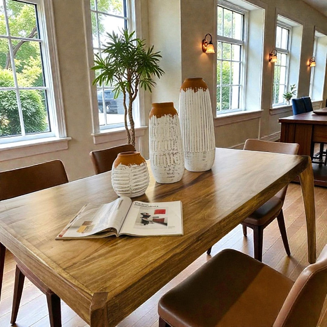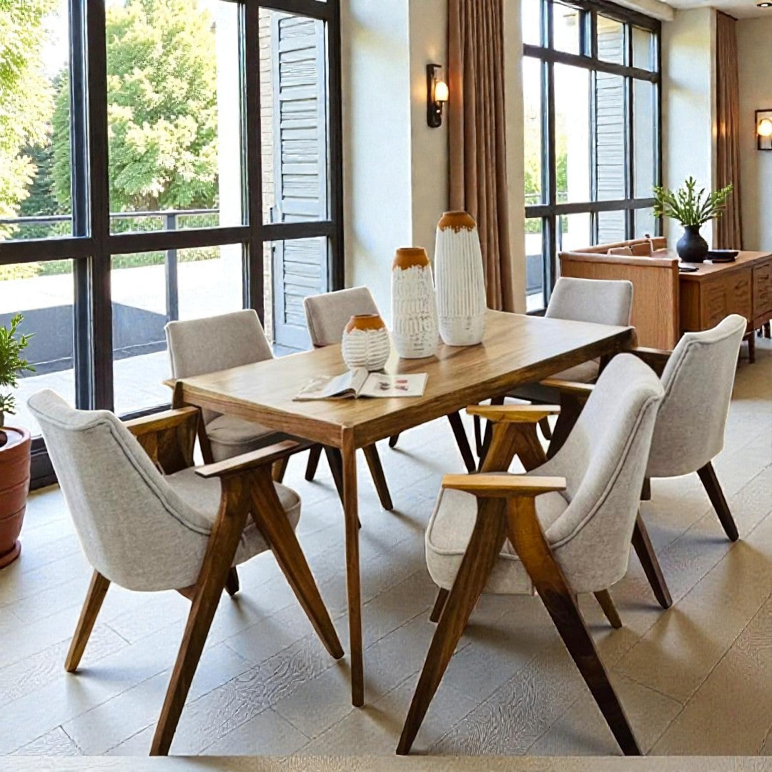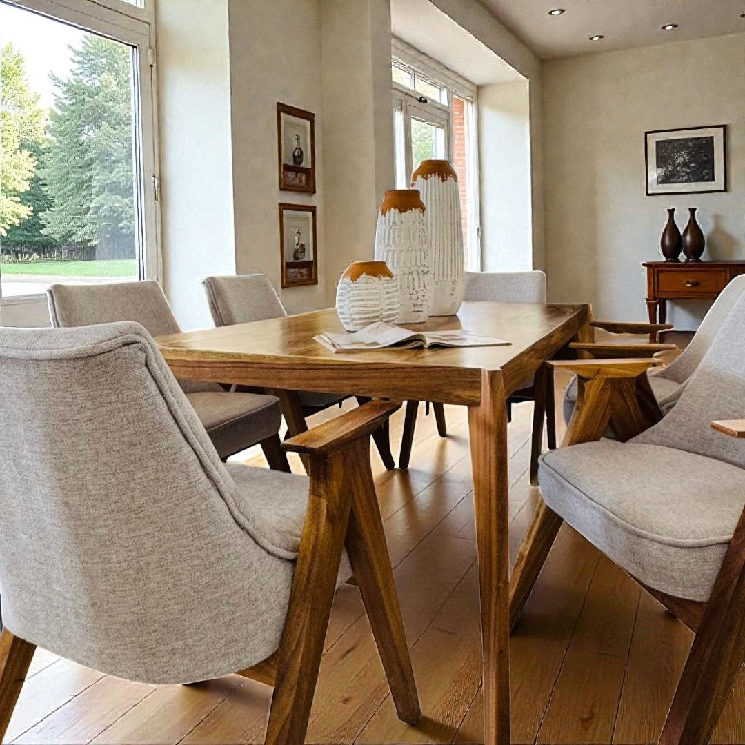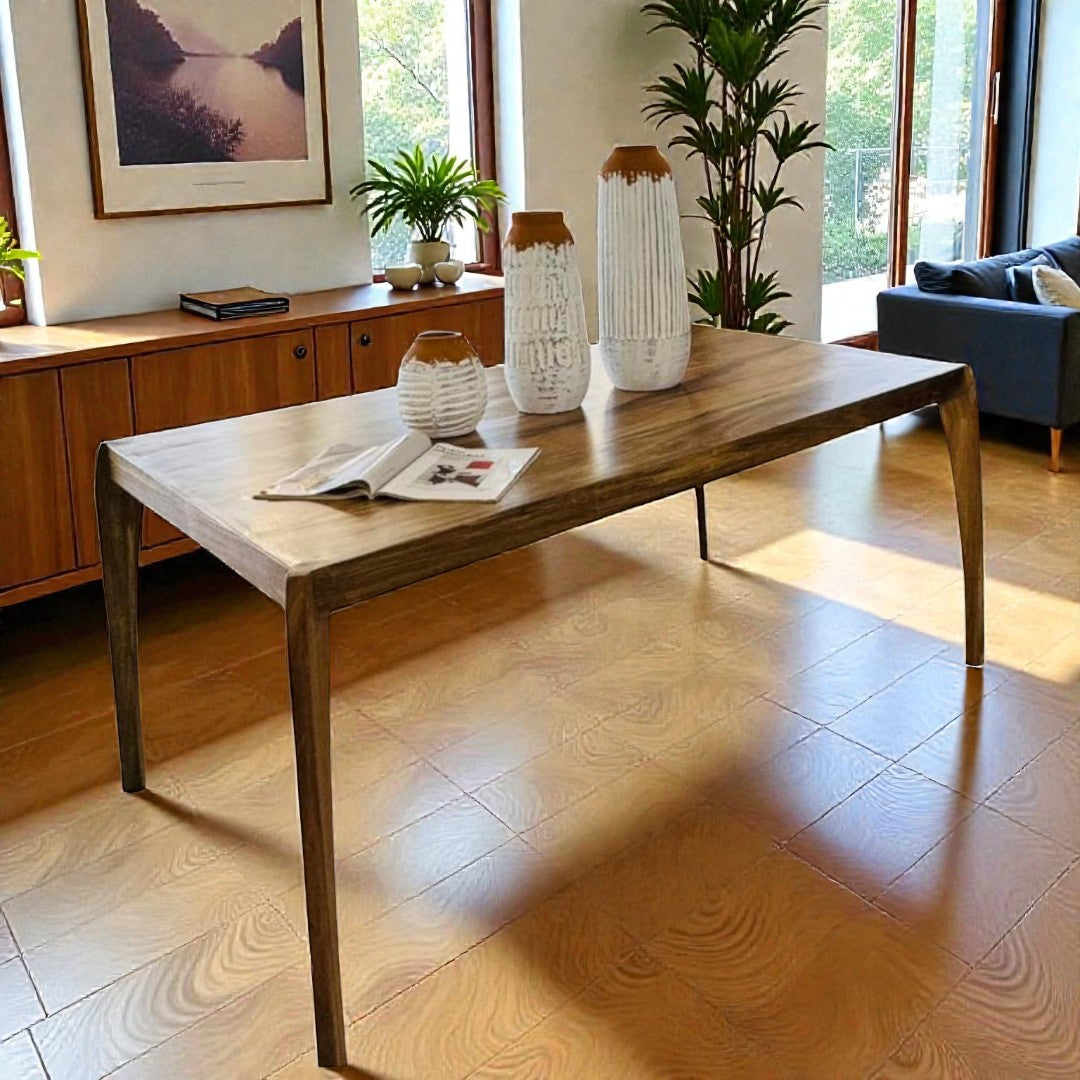 MESA DE COMEDOR COSMO 6P CUBIERTA EN TIRAS DE PAROTA O ROSA MORADA DE DIFERENTES ANCHOS, DE 10MM DE ESPESOR CON REFUERZO DE TRIPLAY DE PINO DE 18MM. MEDIDAS: 1.65 X 0.95 M