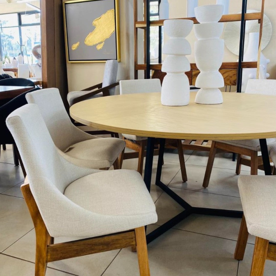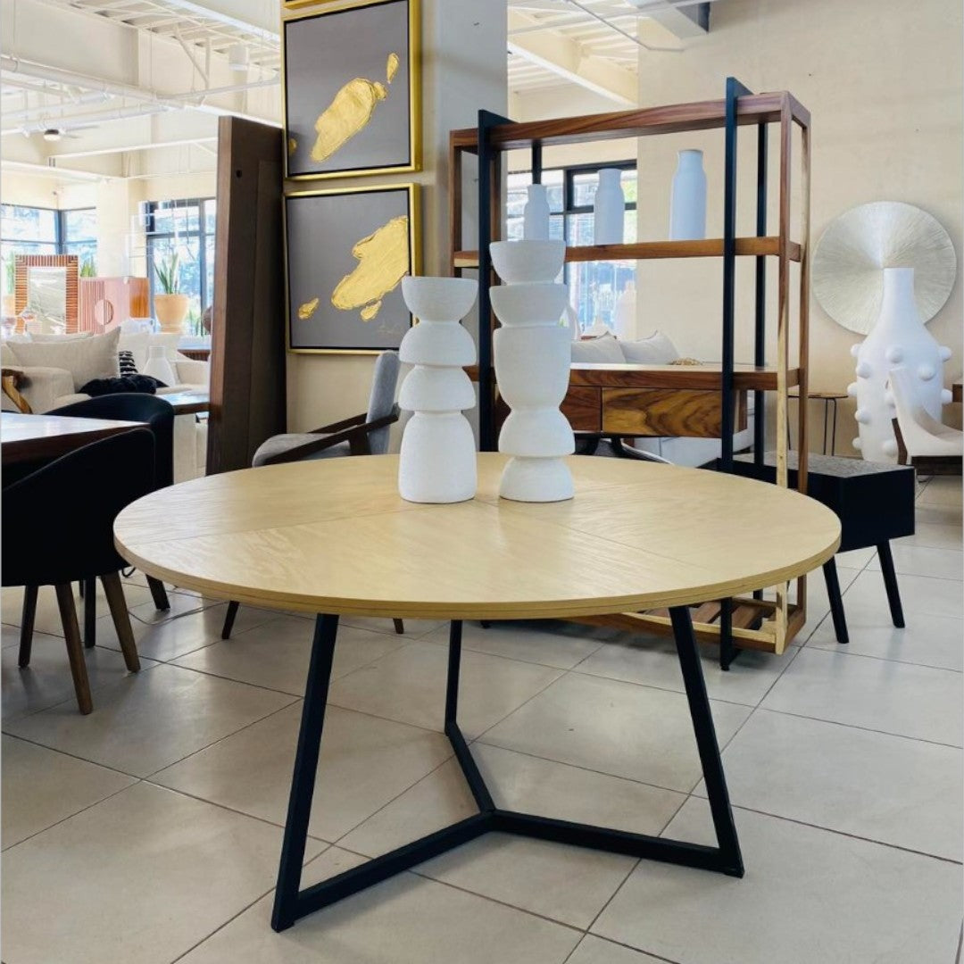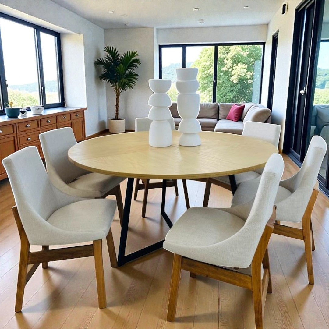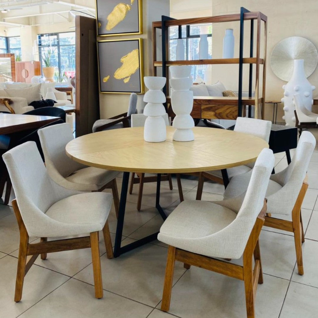 MESA DE COMEDOR VIGO 6P CHAPA ENCINO NIEVE PEDESTAL METAL MEDIDAS: 1.50 M DIAMETRO