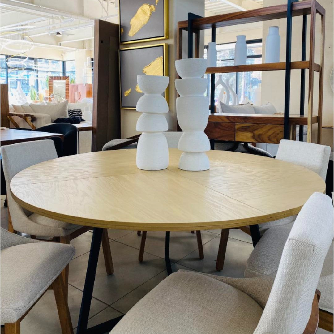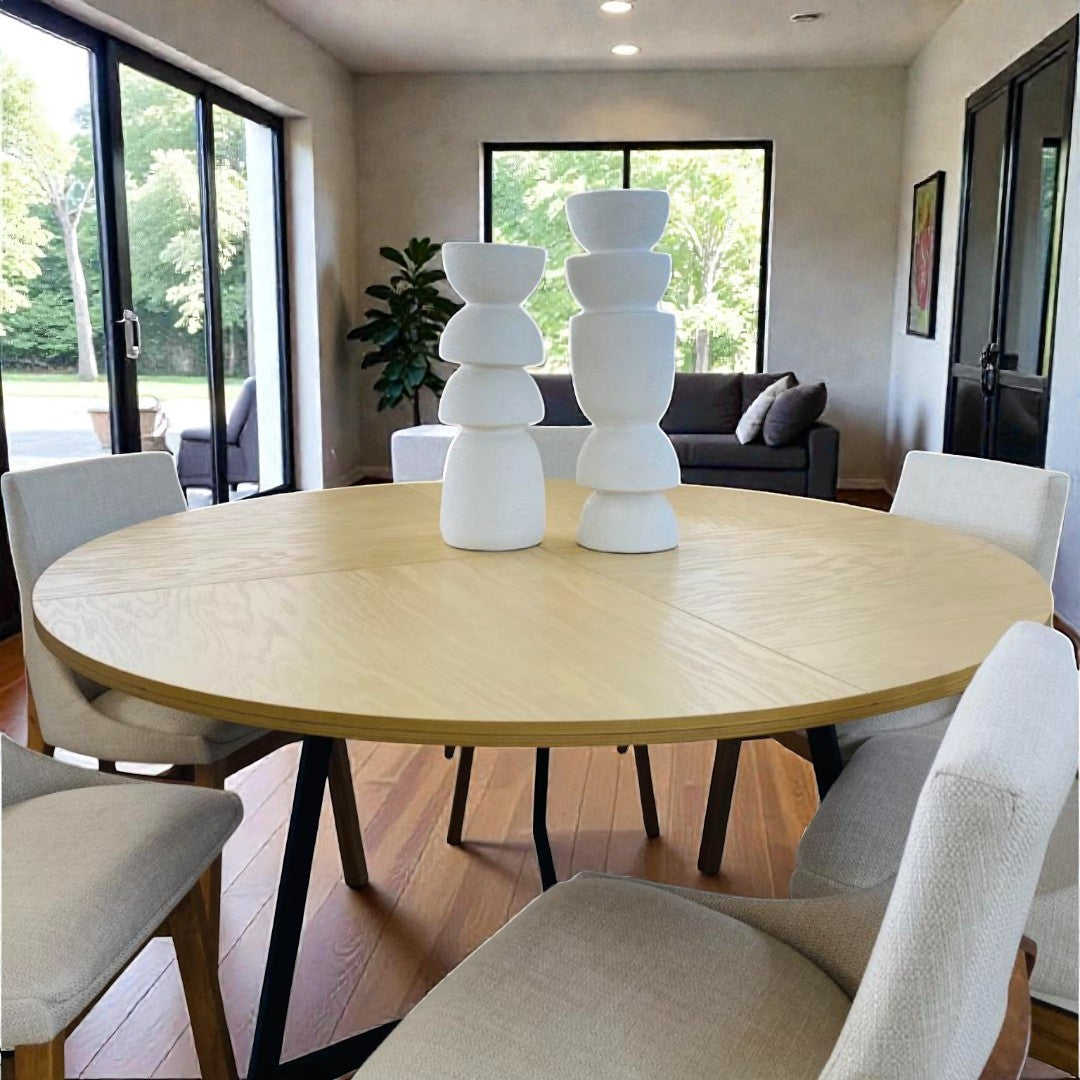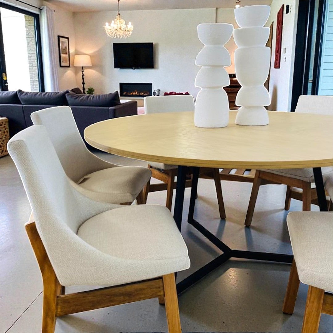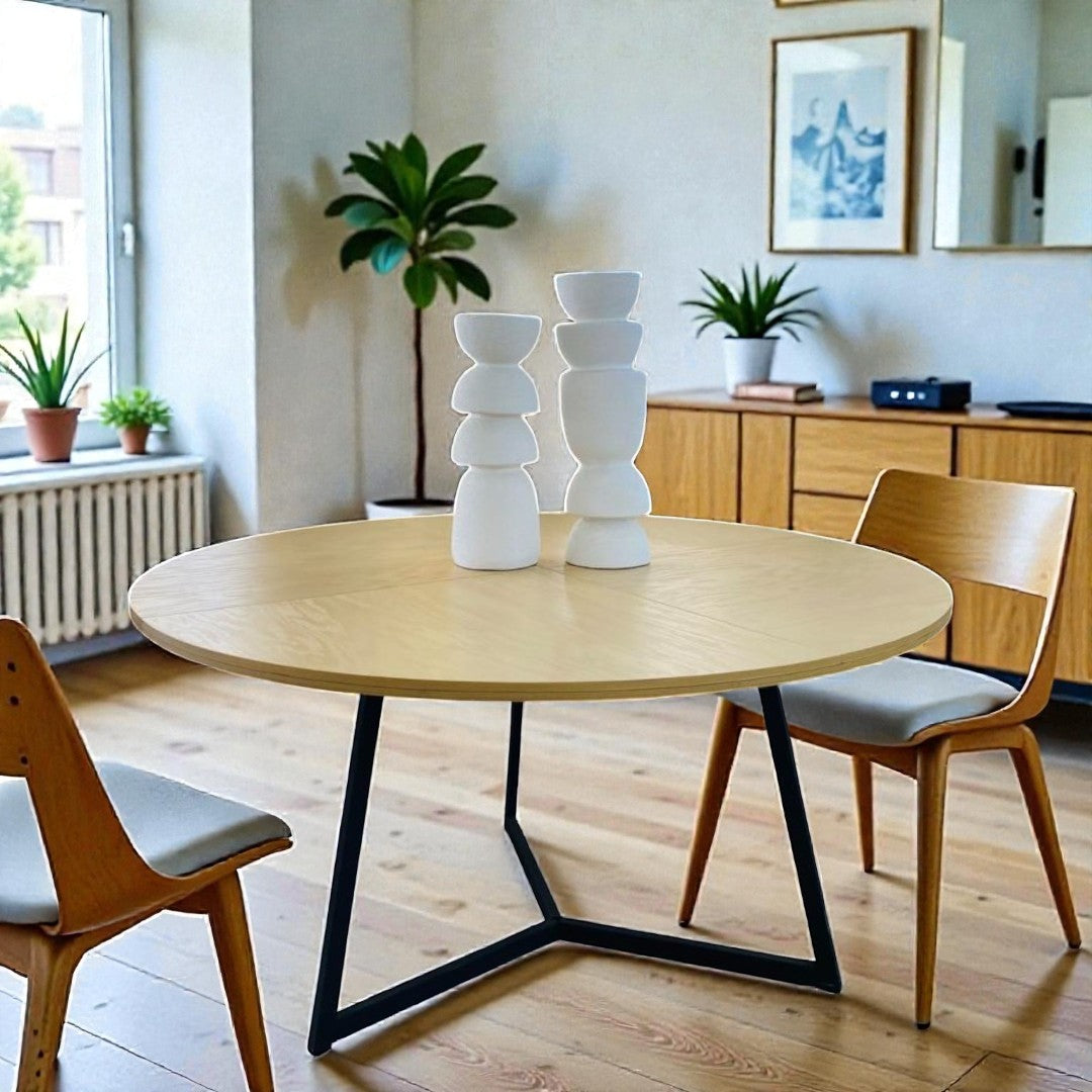 MESA DE COMEDOR VIGO 6P CHAPA ENCINO NIEVE PEDESTAL METAL MEDIDAS: 1.50 M DIAMETRO